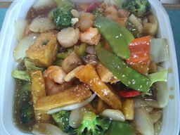 enjoyed our to-go order was good portioned food , their lo mein is like the chow mein in the west coast