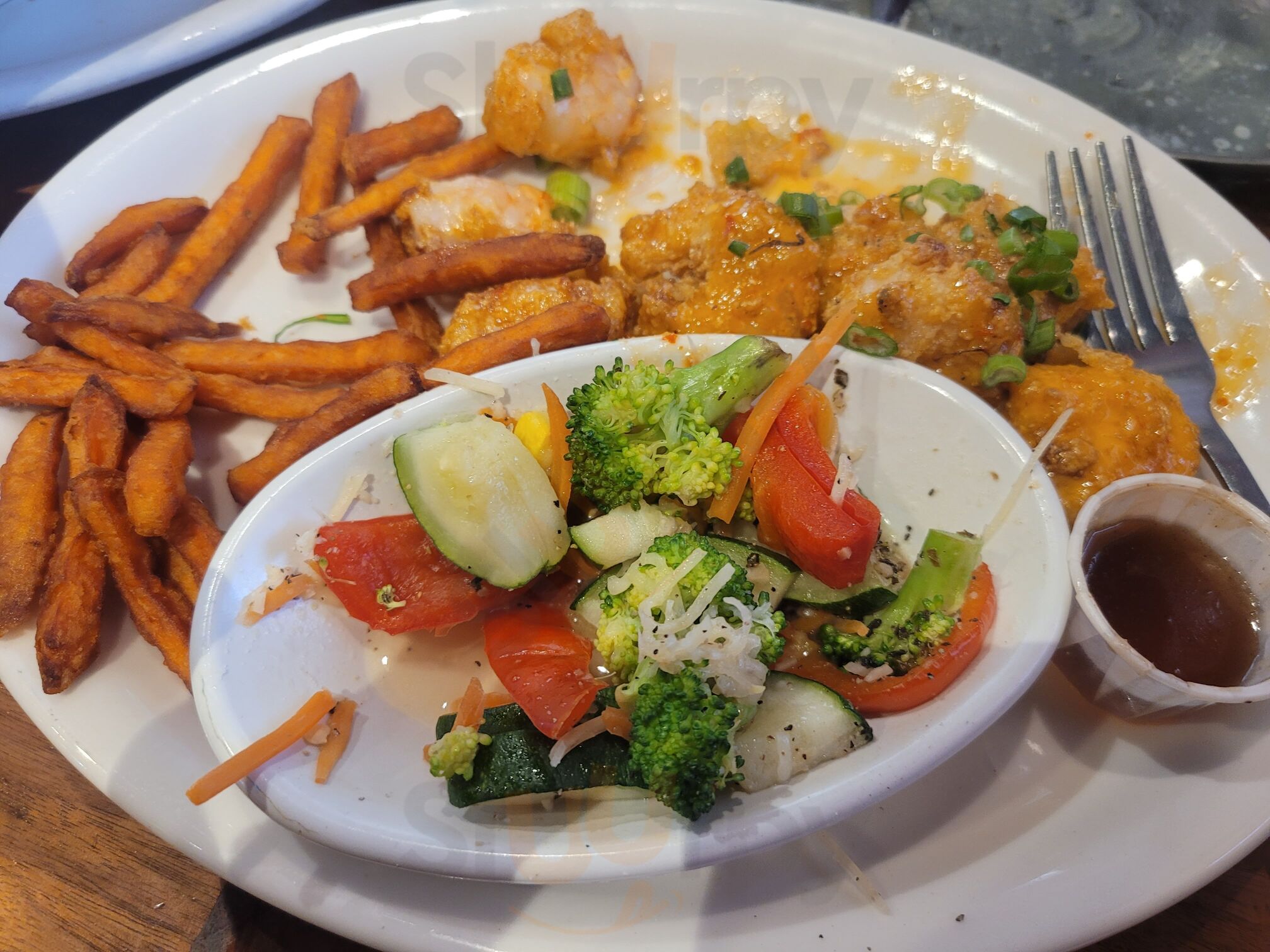 We ordered the jalopeno and cheese fritters, texas grilled chicken, kids cheese pizza and rib and shrimp combo. Zamar was a great waiter with excellent service. Portions could be bigger for the price.