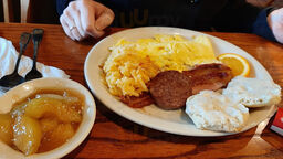 It was a good meal I did not realize that when I ordered the biscuits and gravy that they used to smoke sausage so that part was awful not their fault. But my scrambled eggs and my hash brown casserole we're excellent. Service was a little slow because I am assuming they're short-staffed there were