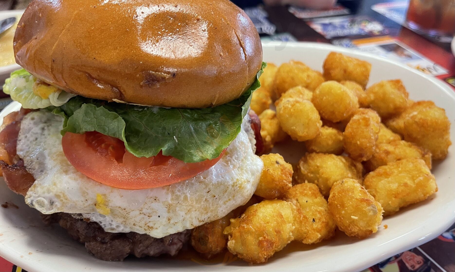 Excellent food and Service. Menu fairly extensive. Specials posted on the boards. Sat at booth. Food came fairly quickly, and was very good. Tables were colorful, Soda bar was cheerful, but could use a little update.