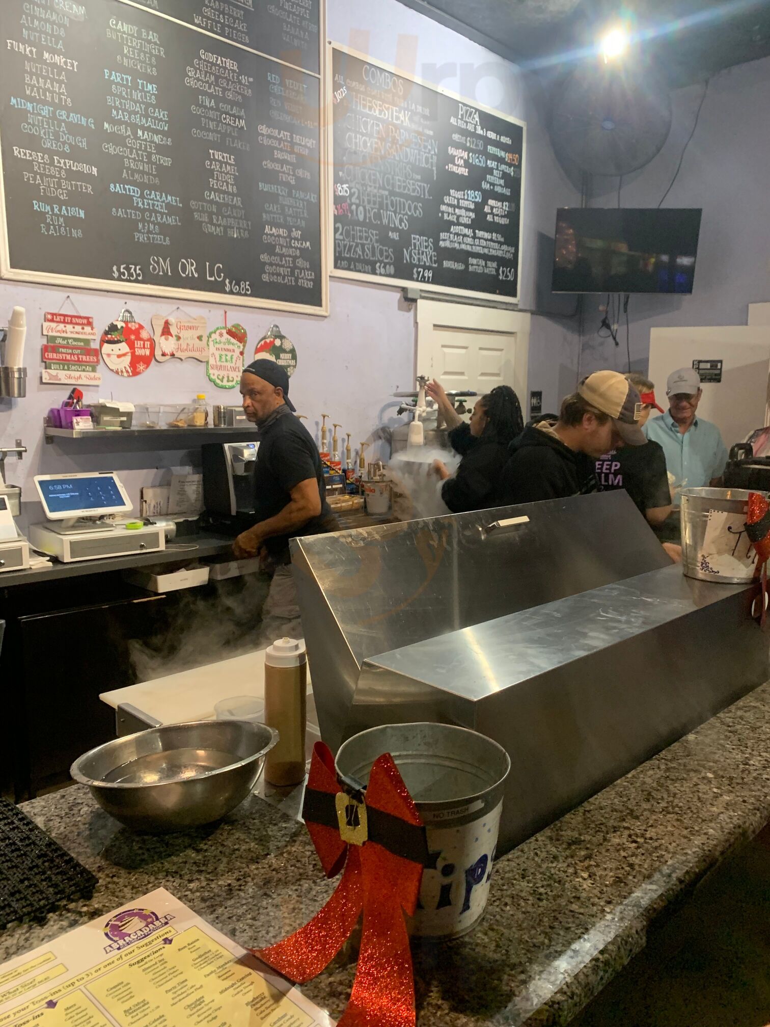 Ice cream made right before your eyes using liquid nitrogen! 😊 You custom create your own from a large selection of toppings, fruit, candy bars, and so on. The small size is large enough for an adult. They serve food as well, but I haven’t tried it. Multiple bounce houses for children.