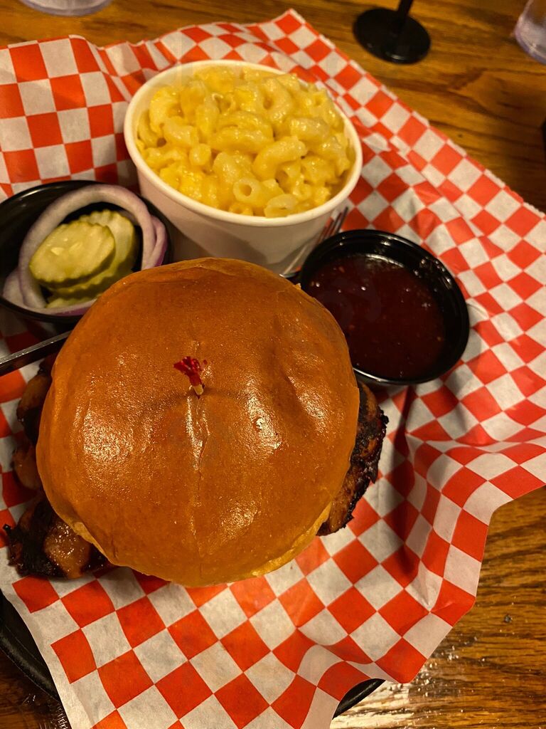 Found this place by accident while visiting and walked around. Cool little place, liked the decor and wood barrel tables. Food was excellent. Meat was very tender, loved the homemade BBQ sauce so much we bought a bottle to take home. That took a little while b/c they made it up fresh, not already pr