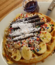 My go to for breakfast. They are fast and the food is delicious. I havent tried the waffles though and this dish caught my attention. I ordered the carrot coconut cake waffle, side of maple chicken sausage and fruit. . Wow wow!! So delicious. I love the chicken sausage. The waffle was moist and
