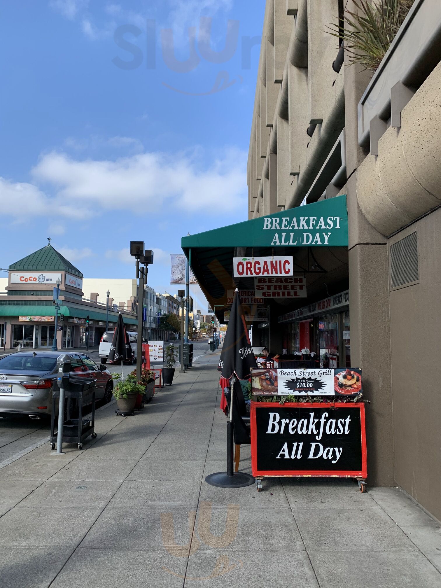 This what a breakfast spot should be. Located by itself on Beach it faces a park.Good friendly service. Delicious sour dough French toast and Eggs Benny. Only negative were the unexpected extra charges for everything...strawberries, blueberries and etc. These made the meal quite expensive.