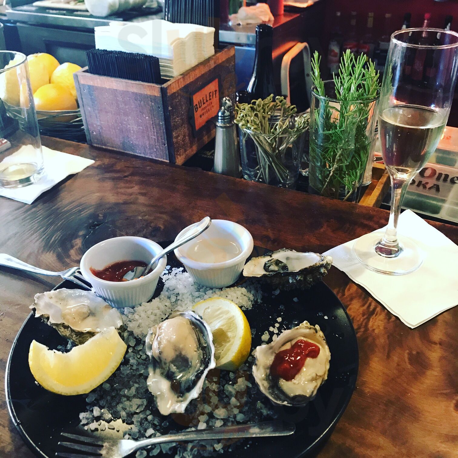 Started with the glass of wine, and it came well served - the bartender topped off the glass. We order oysters